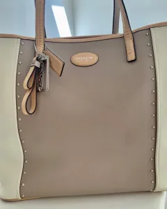 Bolsa Coach color café con beige pequeños estoperoles al frente y atrás súper cómoda muy amplia ideal para llevar todo lo que necesites