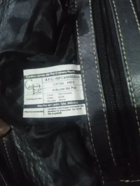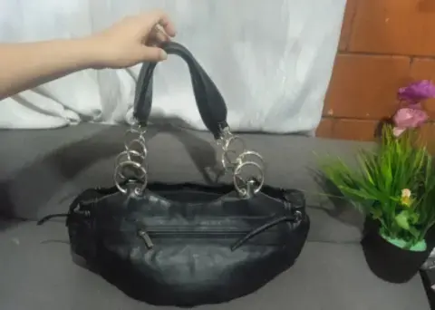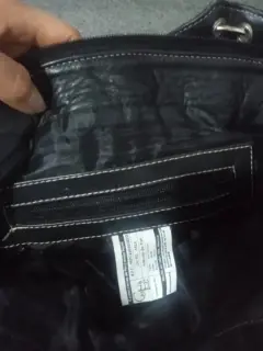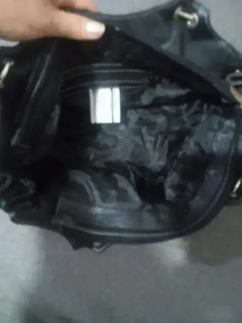 Bolsa de piel 100 % , es negra,con varios compartimentos por dentro, tiene asas con accesorios de metal plateado, cierre posterior,sin detalles está en perfecto estado