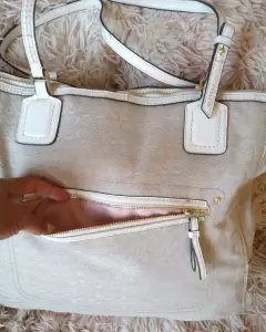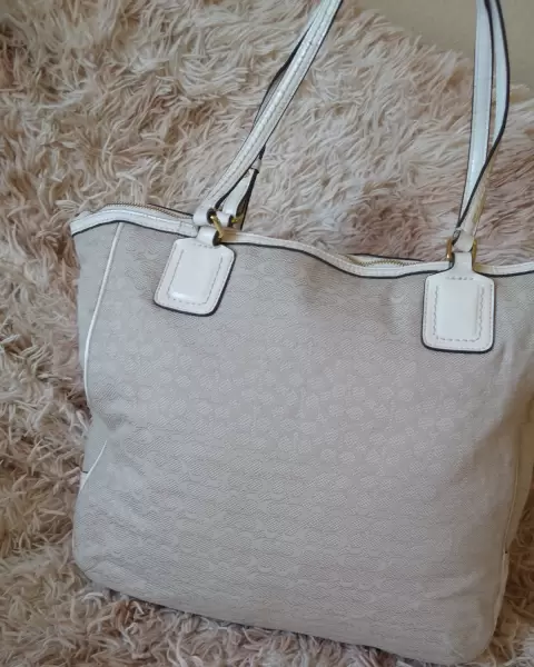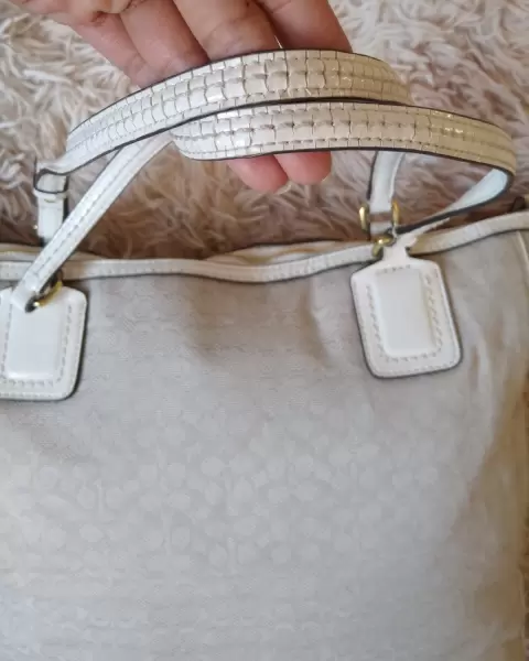 Hermosa bolsa tote coach original muy bonito diseño en color beige combinable. Ideal para la playa. DETALLES DE USO EN LAS ASAS CRAQUELADAS así como LA ORILLA de la parte de arriba o de charol color beige hagan ZOOM, DETALLES TAL COMO EN LAS FOTOS. NO ROTA. Es de los modelos recientes. Puedes buscarla con su código 🥰😍Puedo bajar el precio con pago Inmediato, Ayúdenos todas 🙌🏽🌸Ojo!! Grabó Video antes por seguridad de mi prenda, corroborando su estado 👁️👁️