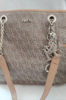 Bolsa grande color arenaMarca H&Co de Cadena con agarradera, al hombro.Exterior está en perfecto estado, salvo una "asa" en las últimas fotografías de puede apreciar aprox de 1 a 2 cm desprendido un borde. La bolsa interna de cierre pequeño por dentro tiene puntos de mancha de tinta.