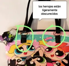 Bolsa tote de la chicas super poderosas. Bolsa tote de la chica súper poderosas está muy linda en perfecto estado nunca se usó solo tiene sus herrajes un poquito obscuros pero es casi imperceptible El material es sintético y algunas arruguitas como en la correa pero todo súper bien las medidas son largo 29 cm y ancho 41 cm en la parte de arriba y en la parte de abajo 34 cm