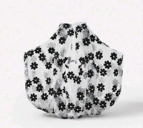 Bolsa tote mini de material muy ligero excelente diseño de flores negras sobre fondo blanco, tela similar al tul pero resistente
