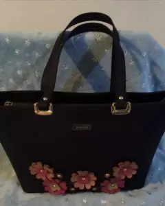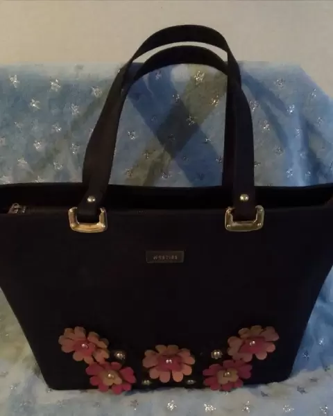 Bolsa tote WESTIES 👜. 😍hermosa bolsa WESTIES color azul marino con decoraciones en flores al frente (bolso en perfecto estado)✍️Asas intactactas (ningún detalle)✍️Forro completamente intacto (no sucio no manchado, sin detalles)✔️Parte de abajo sin detalles (no sucio no manchado no roto no tallado)👉Medidas 26cm alto, 41cm largo, 13cm de ancho👉Unico pequño detalle en el cierre (se muestra en foto)