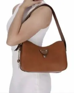 Preciosa bolsa color café, aplicación de borla, estampado liso, con cierre, correa ajustable, adorno metálico desprendible y forro textil. Super fashion. Medidas de la bolsa en la foto. 👜🧡💖