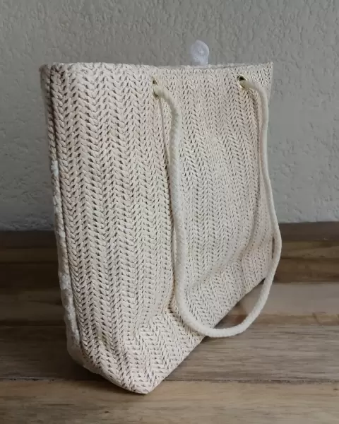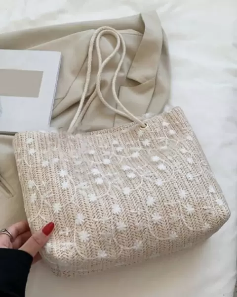 Producto nuevo. Bolso de hombro tipo paja con bordado floral con diseño de lazo de encaje. Forro negro en el interior y botón de imán.Medidas 26 cm de ancho x 8 cm de profundidad x 24 cm de altura. Altura de la cuerda 25 cm, no tiene bolsas en el interior.