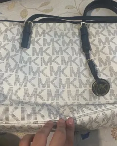 Bolso tote monogram Michael Kors. Bolso tote monogram blanco con azul marino Michael Kors.Es muy amplia y cuenta con múltiples espacios al interior, cuenta con cubre polvo.Medidas 47x30x16 cm