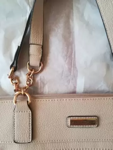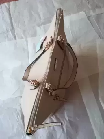 Bolso tipo Tote color rosa nude con cierre y detalle en cadena color oro rosa con compartimentos interiores para celular, llaves etc. Medidas 40 largo 30 alto 15 ancho cm
