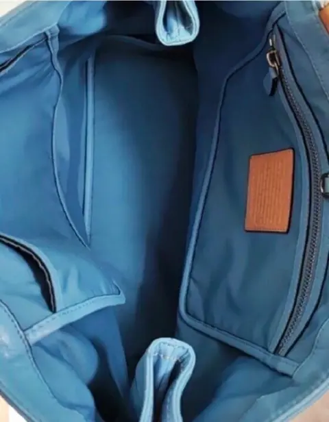 Coach de piel. Hermosa. Bolsa grande de piel con dos tonos de azul, le cabe todo. Como unico detalle tiene en la parte de abajo en las puntas un poco sin color, y le falta limpieza por dentro. Lo demas en perfectas condiciones