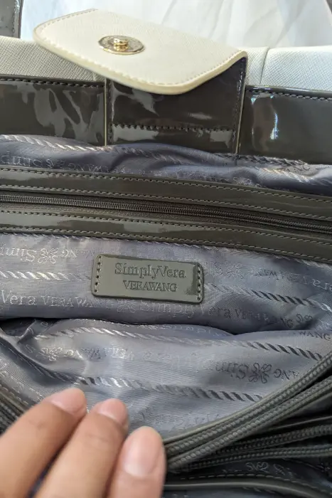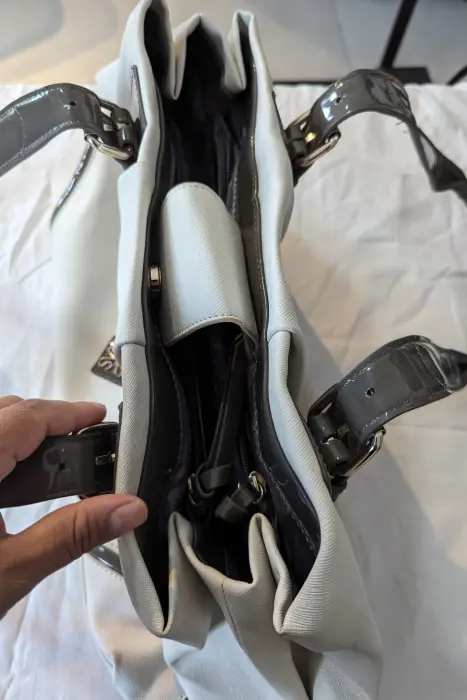 Elegante bolsa de hombro en tono crema con detalles en charol gris y herrajes plateados. Cuenta con amplio espacio interior y diseño distintivo con logotipo decorativo. Ideal para dar un toque chic a cualquier conjunto. En excelentes condiciones y lista para complementar tu estilo.Medidas 38 x 25 CM aprox