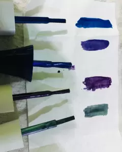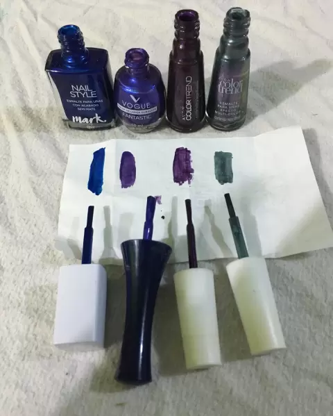 Sin 4 tonos de esmalte para uñas, 1 de la marca Mark azul eléctrico (12ml) con acabado semi mate, 1 marca vogue (10ml) Belladona larga duración, 1 marca colortrend (8ml)azul caleidoscopio efecto multi-color y 1 marca color trend (8ml) morado con brillos.