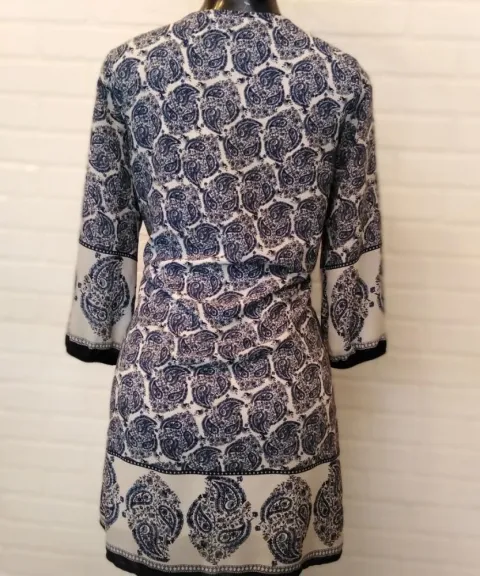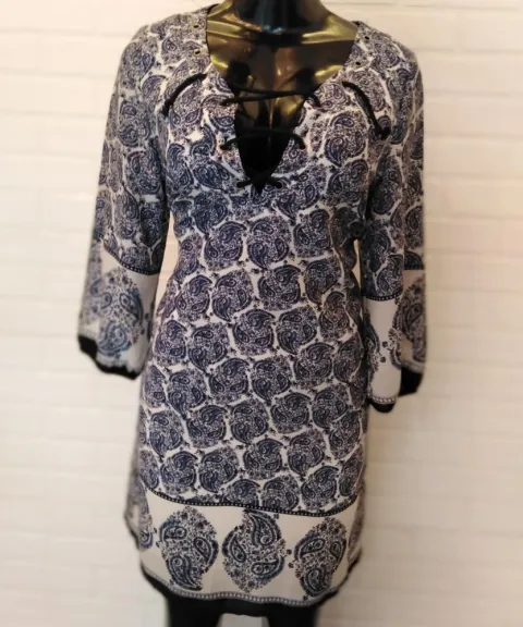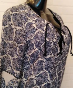 1710-09 Vestido corto color Azul, corte Canesu, escote en V, con cintas en la parte superior, diseño en tono blanco. Talla: Ch: Busto: de 84 a 90cm Cintura de 68 cm a 72 cm cadera de 88 cm a 96 cm