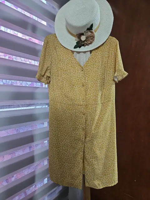 Amarillo sincrético. Vestido corte recto, cómoda composición. Tela en estampado floreado blanco, forro ligero. Botones forrados lo hace particularmente elegante.