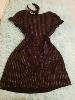 Chulisimo vestido manga corta, todo decorado con lentejuelas en color bronce y la tela es de color negro, composición de la Tela: algodón nylon, talla L también lo veo a M, manga corta. Esta bellisismo