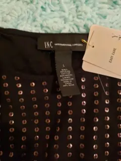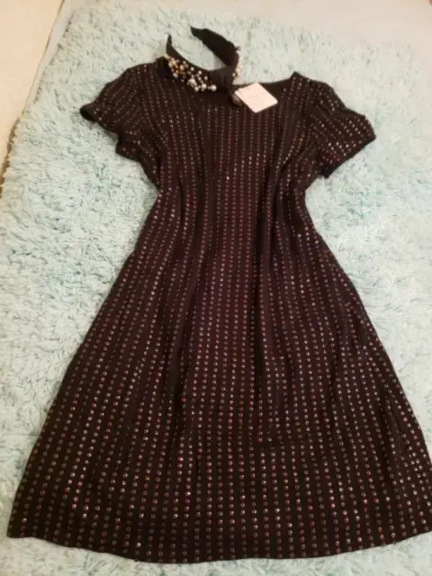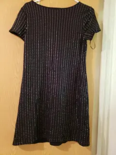 Bellisimo vestido International comp.. Chulisimo vestido manga corta, todo decorado con lentejuelas en color bronce y la tela es de color negro, composición de la Tela: algodón nylon, talla L también lo veo a M, manga corta. Esta bellisismo