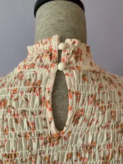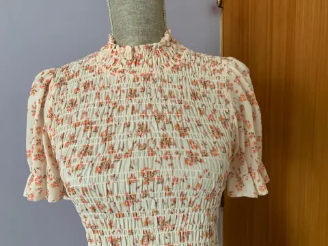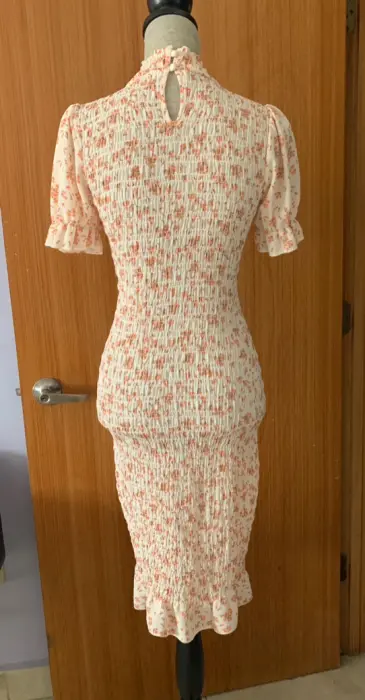 Bellísimo vestido que lleva hilos elásticos en todo el cuerpo, para que valla 100% pegado al cuerpo. Fondo ligeramente Perla, con estampado floral tipo vintage, bella manga tipo globo.