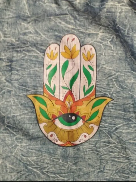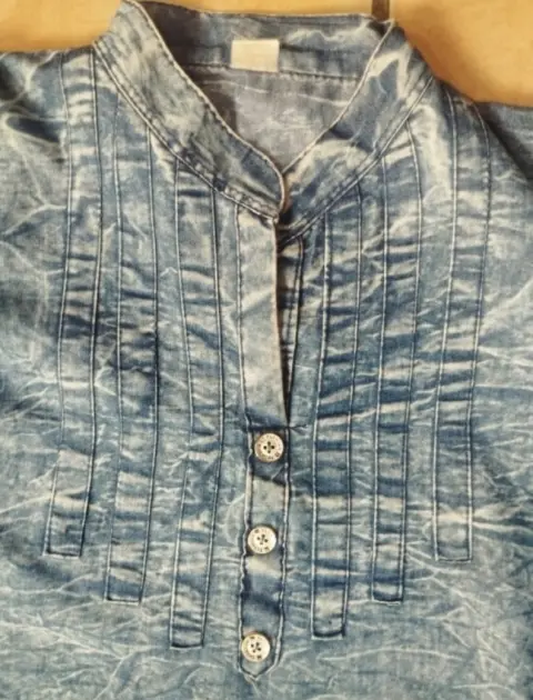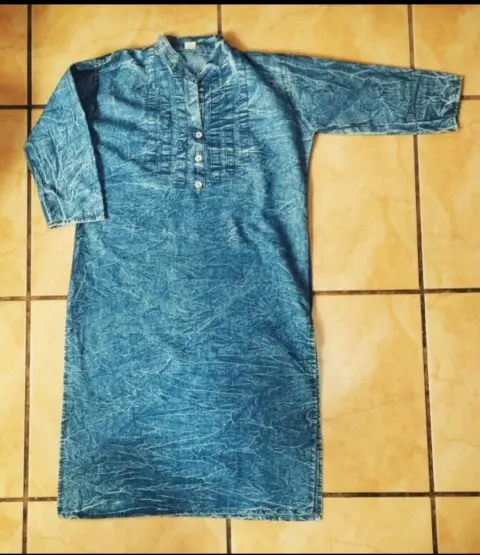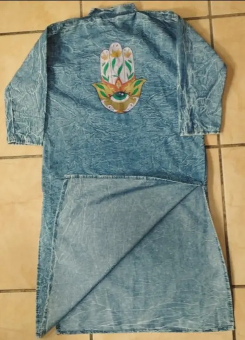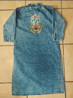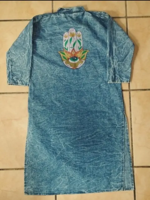 Moderno vestido o blusón de mezclilla con aberturas laterales. Tela rígida.Cuenta con un lindo estampado de la mano de Fátima.Manga 3/4.Unitalla que abarca desde la 4 a la 7.