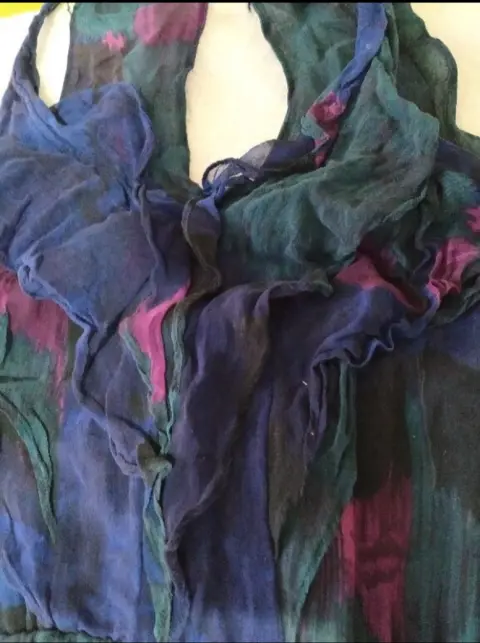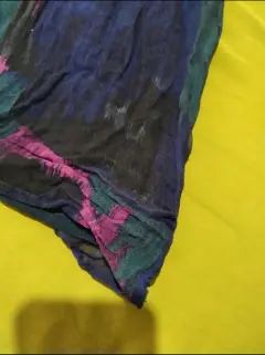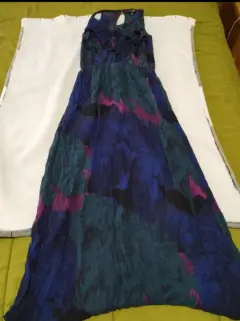 Mide de axila a axila 43, de la cintura tiene resorte, de largo 1.40 m es de tela semitransparente pero tiene forro, y es de color azul marino con rosa y verde