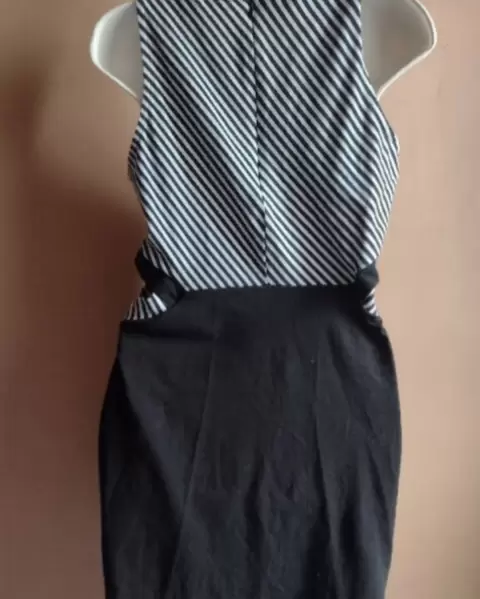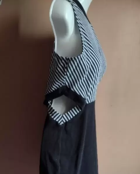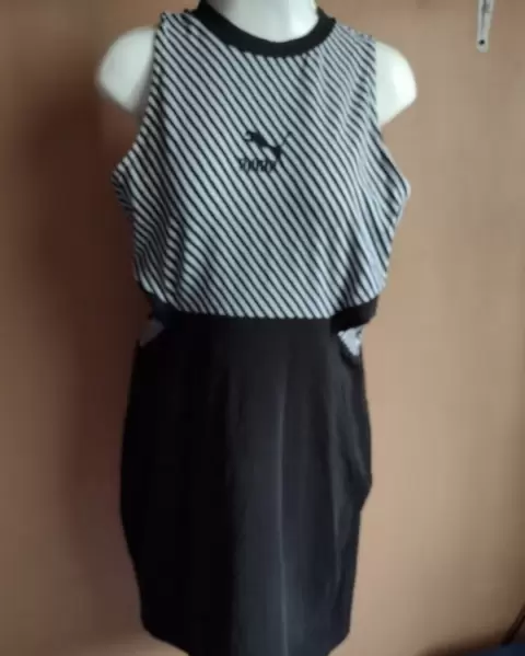 Es un lindo vestido deportivo y casual , ideal para usar con tenis , en tela de algodón con spandex 🤩 escote a los costados en color blanco y negro , una puesta , talla ,L
