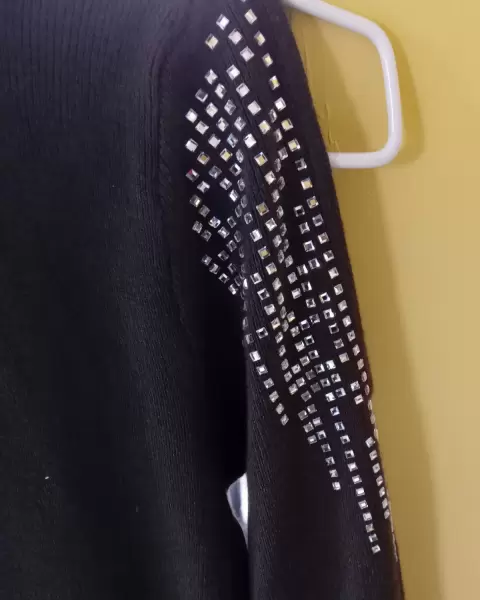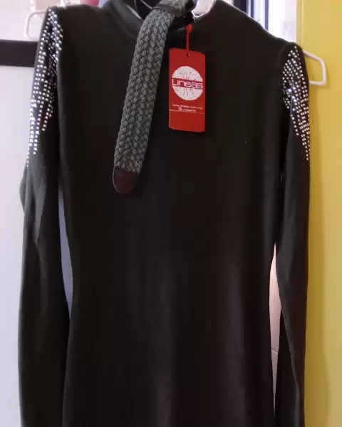 Bonito vestido largo, color verde oscuro talla M, hombros descubiertos y estoperoles como adornos.Es un modelo diferente y original.