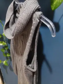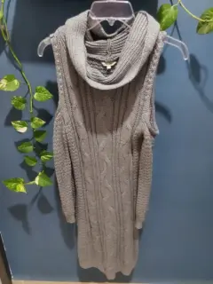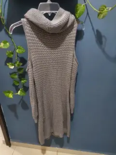 Bonito vestido gris, largo tejido, con aberturas en los hombros, muy calientito para invierno