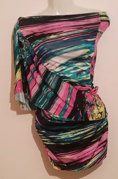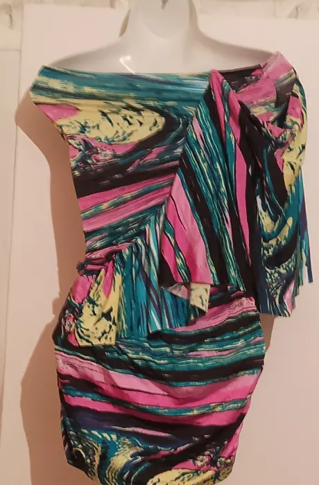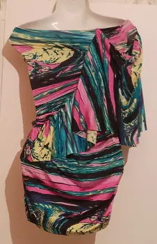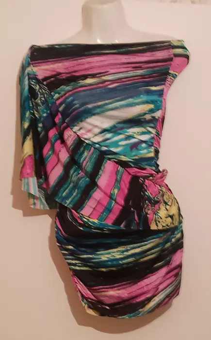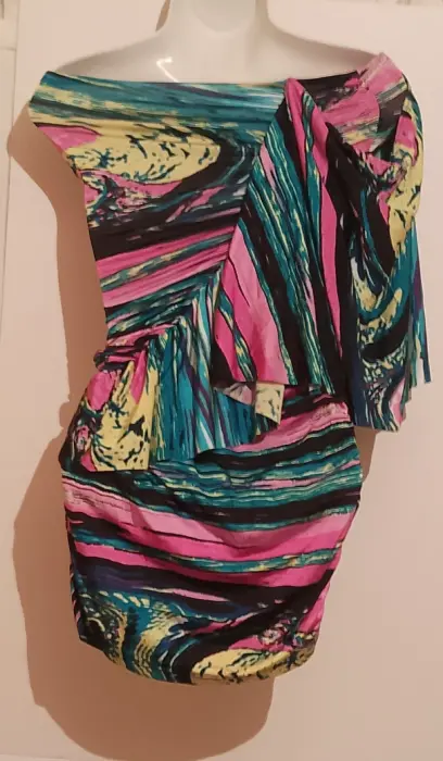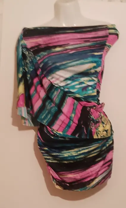 Bonito vestido multicolor, con diseño de moda, talla S, mide en pecho 36 cm, en cintura 30 cm y de largo tiene 86 cm . Hombros descubiertos, estira para amoldarse al cuerpo, en excelentes condiciones