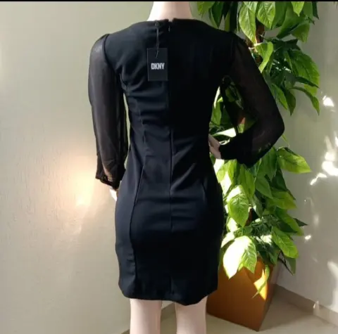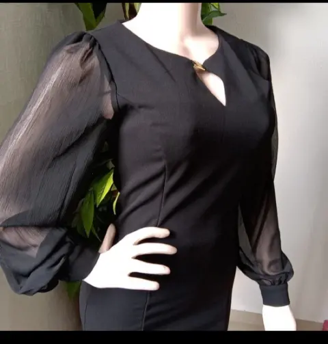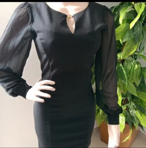 Bonito vestido negro. Descripción:Vestido color negro. Escote redondo con broche en niquel color dorado. Ligera abertura en el pecho. Manga larga, tela transparente. Ceñido al cuerpo. Cierre invisible.Talla XS, queda a S también.
