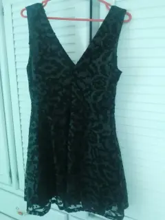 Bonito vestido negro Just me. Bonito vestido Justo me, corto, confeccionado en encaje con aplicaciones tipo piel cosidas, tul para vuelo y forro poliéster, corte en V frente y espalda, sin mangas, cierre invisible, talla grande.
