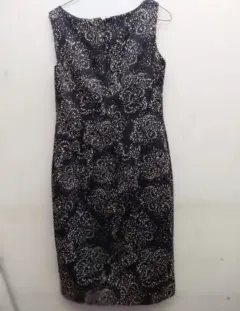 Es un vestido entallado , la prenda es negra y contrasta con unas flores blancas el estampado es en todo el vestido, es talla chica no.4 en la espalda tiene un cierre que empieza en el cuello y acaba en la cadera es usado el vestido y solo tiene un arreglo en la parte de abajo del cierreTambién cuenta con una chamarra del mismo estampado