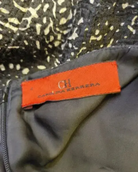 Carolina Herrera. Es un vestido entallado , la prenda es negra y contrasta con unas flores blancas el estampado es en todo el vestido, es talla chica no.4 en la espalda tiene un cierre que empieza en el cuello y acaba en la cadera es usado el vestido y solo tiene un arreglo en la parte de abajo del cierreTambién cuenta con una chamarra del mismo estampado