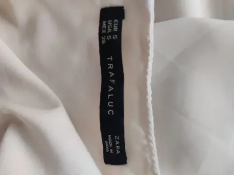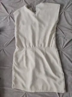 Vestidito de gasa con fondo, color beige y aplicaciones doradas al frente, muy elegante.