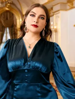 Elegante vestido de talle alto y manga larga en color azul. Material satén, manga tipo obispo y corte recto. Con botones y cierre.