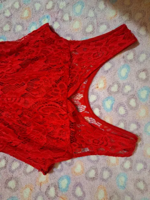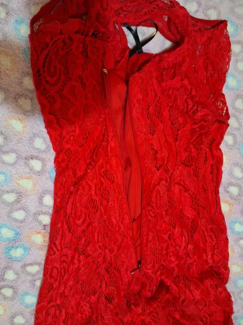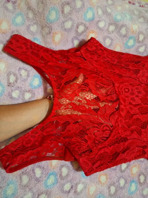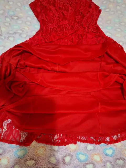 Elegante vestido rojo de encaje. Elegante vestido corto color rojo, de encaje, sin manga y cuello en v, tiene vuelo. De enfrente tiene esponjas en las copas. De atrás tiene algo de transparencia en la espalda. Tiene doble forro de color rojo que lo hace lucir con más volumen en la parte de la falda. Cuenta con cierre lateral y broche. Es talla 7. De la marca Pomposo