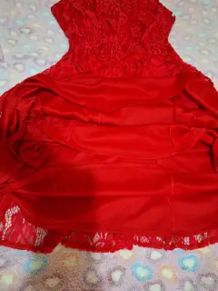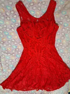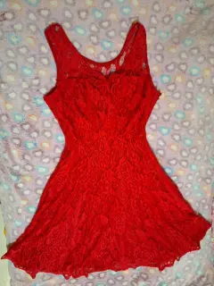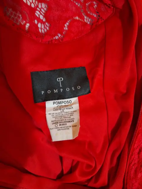 Elegante vestido corto color rojo, de encaje, sin manga y cuello en v, tiene vuelo. De enfrente tiene esponjas en las copas. De atrás tiene algo de transparencia en la espalda. Tiene doble forro de color rojo que lo hace lucir con más volumen en la parte de la falda. Cuenta con cierre lateral y broche. Es talla 7. De la marca Pomposo