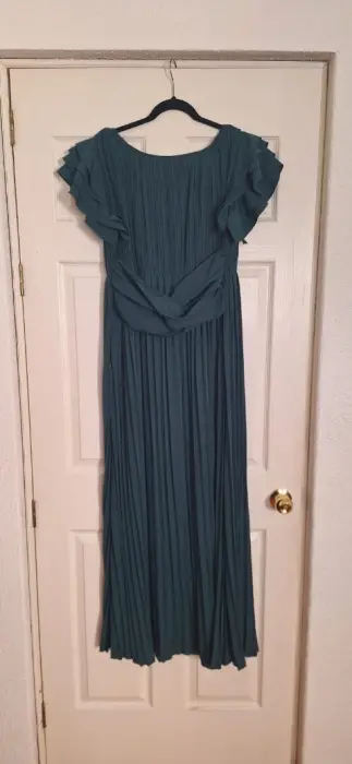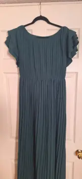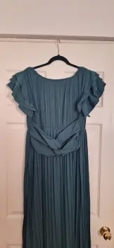 Vestido verde con pliegues y olanes en las mangas. Corte línea A, luce increíble. Para eventos de día o de noche.