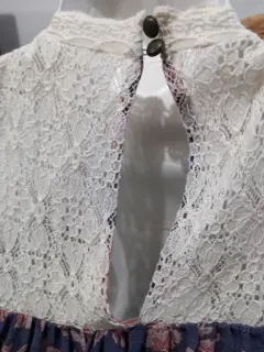 Hermoso vestido que combina varias texturas, encaje, gasa y tiene forro. Ligero, sin mangas y dos botones en espalda. Fresco y juvenil