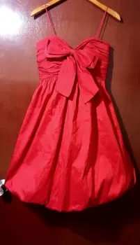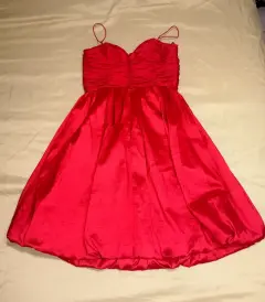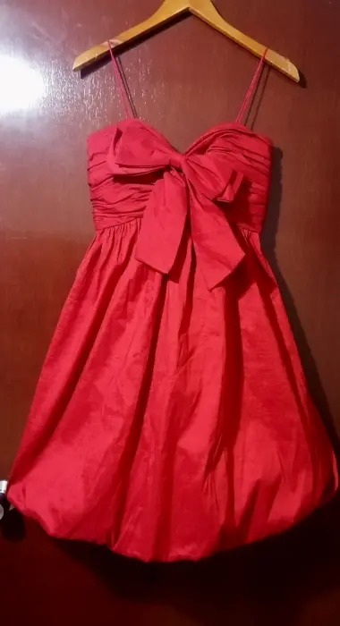 Vestido satinado color rojo, con un fabuloso moño en el pecho el cual le puedes quitar y queda forma de corazón, talla 4 queda a S, no roto ni manchado, hago envíos rápidos y doy precio