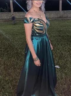 Hermoso bestido talla S. Talla S color verde esmeralda muy agusto cómodo lo use unas pocas horas el día d mi evento casi como nuevo