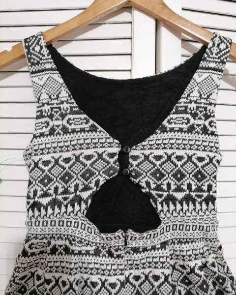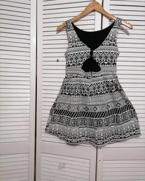 Hermoso Minivestido con cierre posterior hasta cintura, escote en espalda y botonadura en área de omóplatos. Queda realmente corto. Muy bonito y marca la cintura.