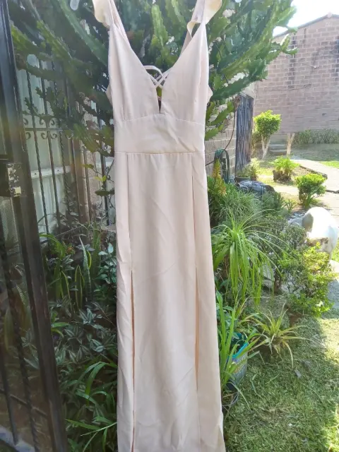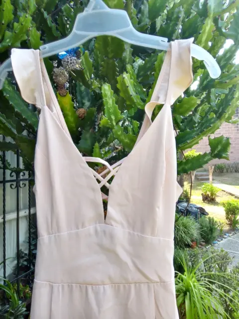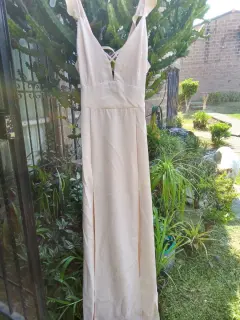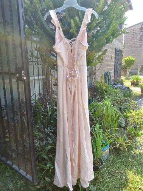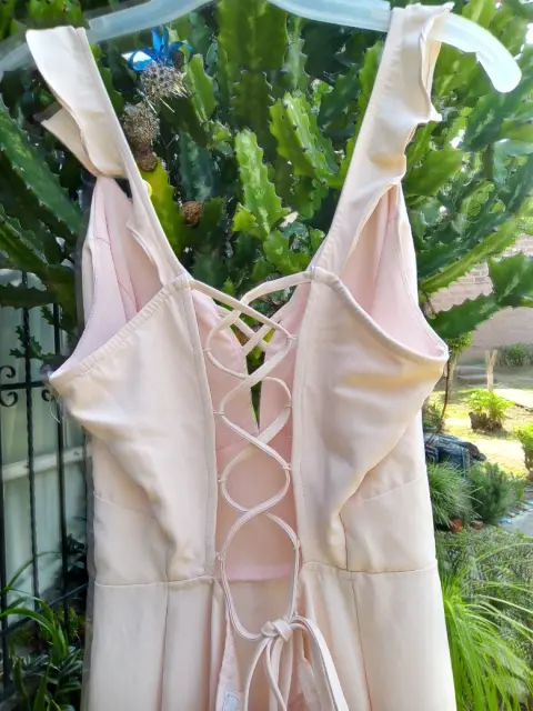 Hermoso muy lijero. Vestido de tirantes de holan, coqueto escote en frente, y escote atrás tipo corset, doble abertura entre pierna, color rosa pastel talla L