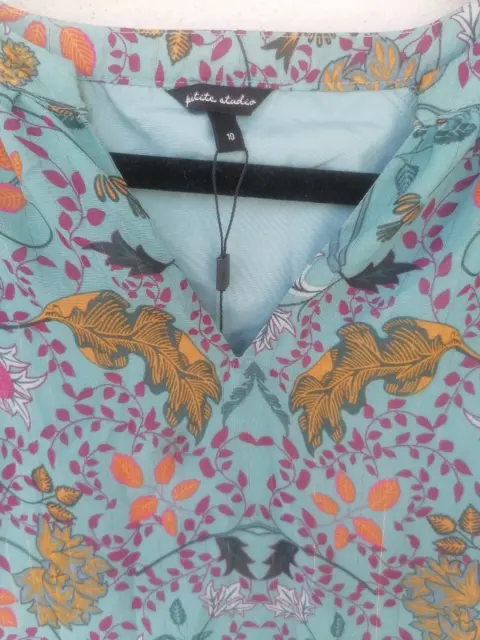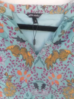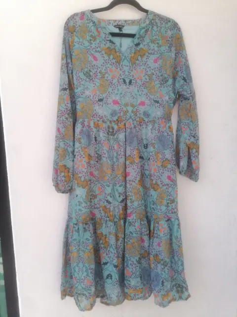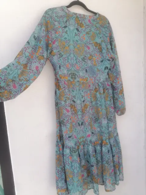 Hermoso vestido talla M (10), color verde tipo turquesa apagado, con flores de colores amarillo, rosa fiusha y naranja.
