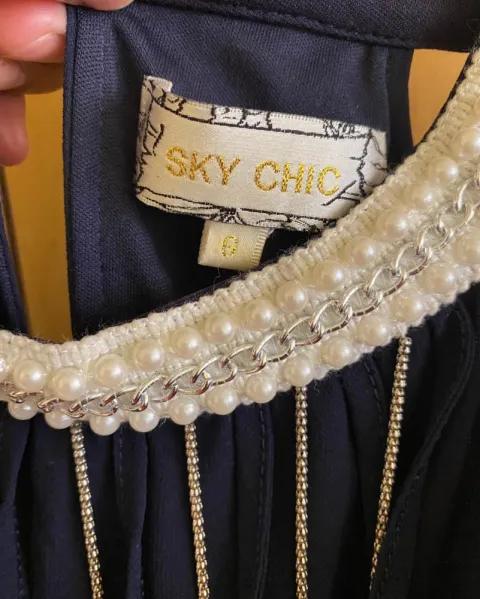 Hermoso vestido con cuello tipo halter con perlas color azul con blanco Está completamente nuevo solo que de tenerlo guardado un resorte de los botones se está jalando anexo foto