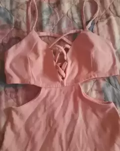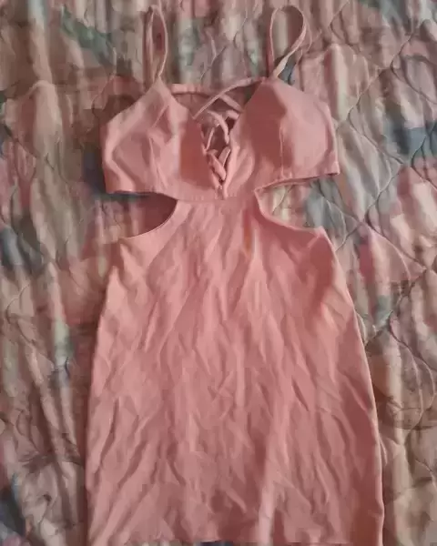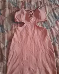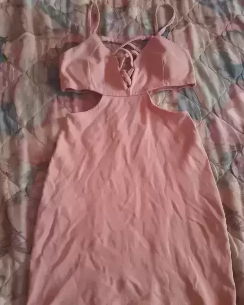 Hermoso vestido con escotes en costillas y pecho, color rosa palo, talla S. Se amolda al cuerpo.