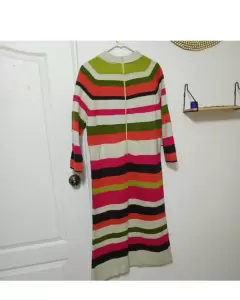 Hermoso vestido con rayas horizontales de colores. Queda en talla L/XL(Yo lo usaba con un cinturon en la cintura). Ideal para el otoño-invierno.MedidasHombro a hombro: 39cmAxila a axila: 49cmLargo: 115cmCintura: 45cm
