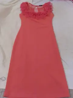 Hermoso vestido de cóctel, entallado de tres cuartos de largo, con detalle al frente y espalda en transparencias, flores y encaje del mismo color.