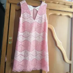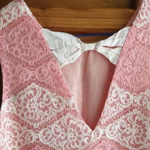 Hermoso vestido de encaje. Hermoso vestido de encaje estilo a gogo, usalo para fiestas, color salmón con hueso, escote trasero con listón hueso, solo 2 puestas