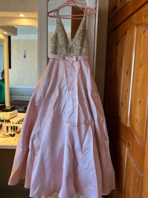 Hermoso vestido de fiesta con pedrería con lateada en la parte de arriba , color palo de rosa . Talla M , marca Bicici . Un solo uso