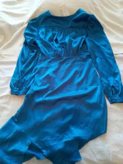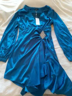 Hermoso vestido de fiesta nuevo, tres cuartos de largo. Manga larga, con escote v y detalles plateados a media pierna. Con forro.