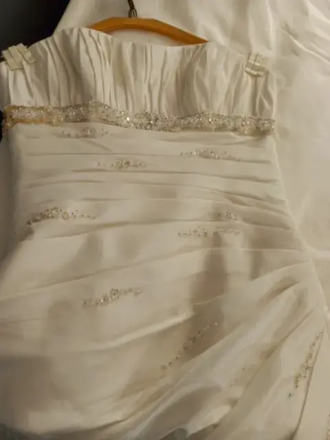 Hermoso Vestido de Novia. Vestido de Novia strapless color Ivory , detalle de pedrederia al frente y en cauda (integrada ) , Marca Angela Betasi .Talla M (32 )100 % poliester 100% Satin