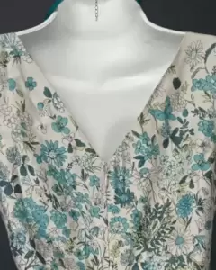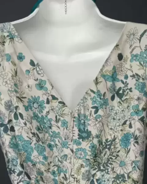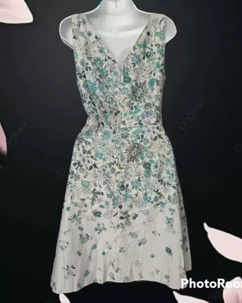 Vestido floral con delicados colores beige y verdes. Trae forro, falda en A y ligero escote en V por la espalda. Es tela que no estira pero arma muy bonito.