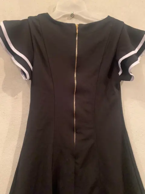 Hermoso Vestido Negro casual. Vestido negro línea A con dos olanes en las mandas muy discretos con vivos blancos , tallas 36, 38, 40 y 42 las tallas son reducidas, 95 % poliéster y 5% elastano, cierre en la espalda del cuella hasta la cadera Te encantará